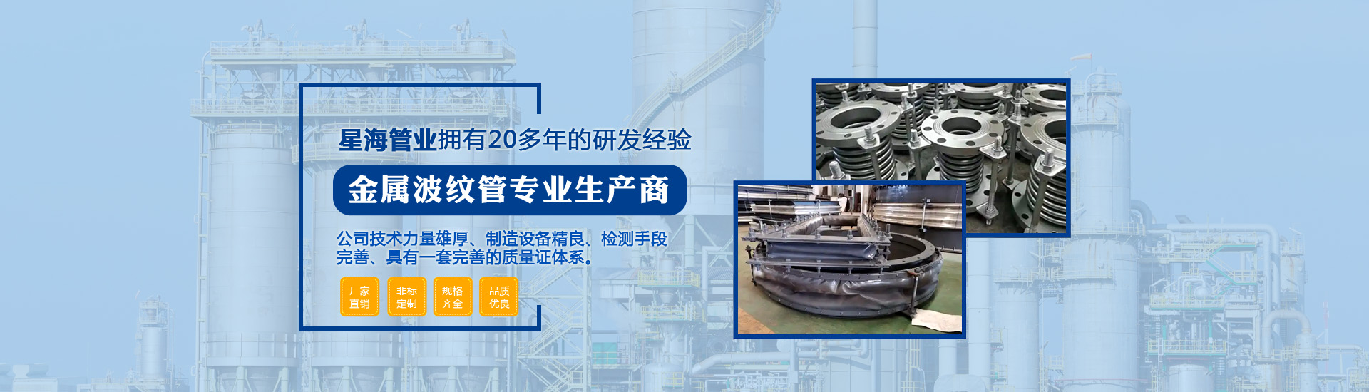 泰州市星海管業有限公司座落于風景如畫的江蘇魚米之鄉,是一家專業生產金屬波紋管的高新企業。本公司技術力量雄厚、制造設備精良、檢測手段完善、具有一套完善的質量證體系,系列產品齊全、質量可靠、價格合理,深受廣大用戶的信賴和好評。主導產品是金屬波紋膨脹節,不銹鋼金屬軟管,滑動式伸縮節,填料函式伸縮節,橡膠補償接頭,各種型號彈性吊架...